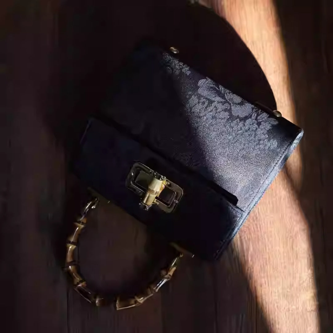 Experience the unique charm of Gambiered Silk. This handbag features a striking contrast between its deep, matte black background and the vibrant, indigo-blue floral pattern.