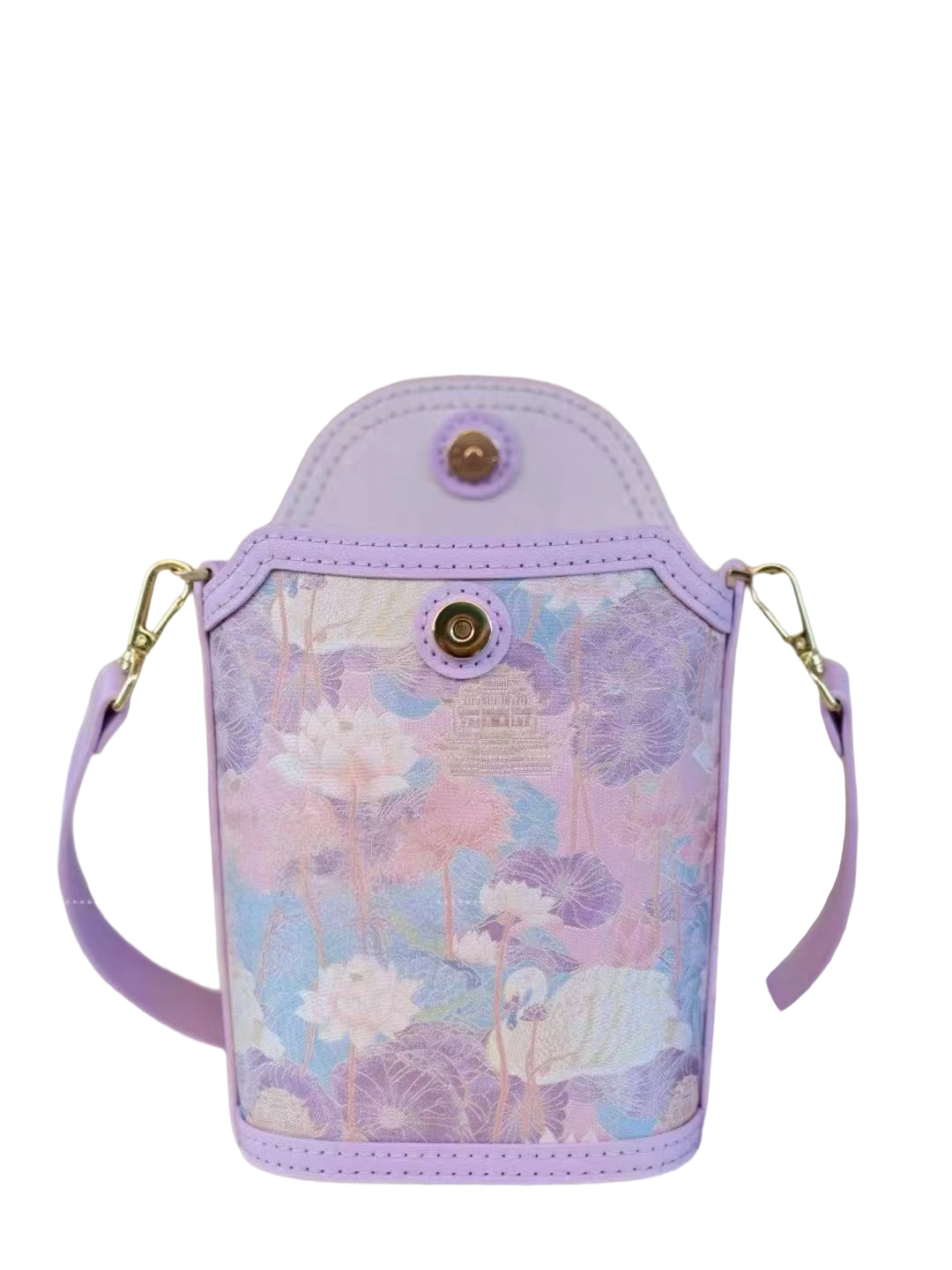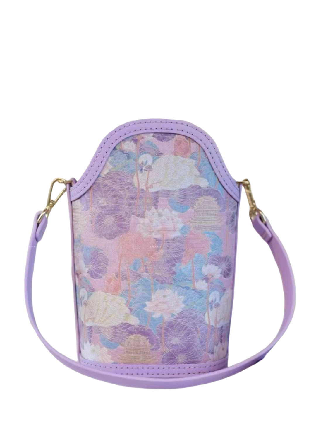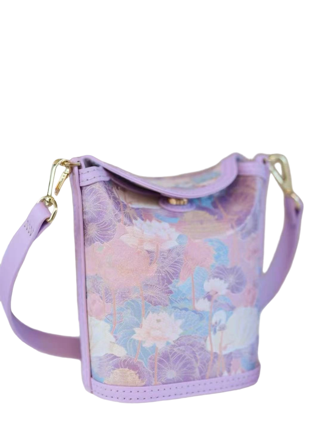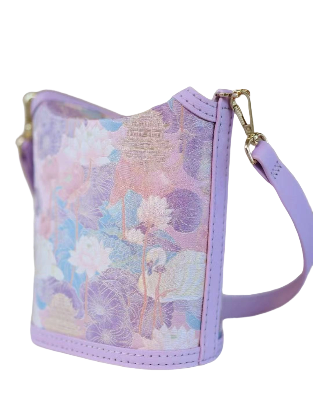 A modern ballet of color and craft. The "Swan Lake" box bag features a graceful swan delicately rendered on a regal purple Song Brocade. Accents of twilight blue and misty pink evoke the shimmering water's edge, creating a dreamlike palette. It is ancient artistry, reborn with contemporary elegance.