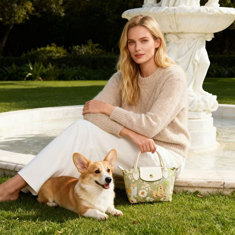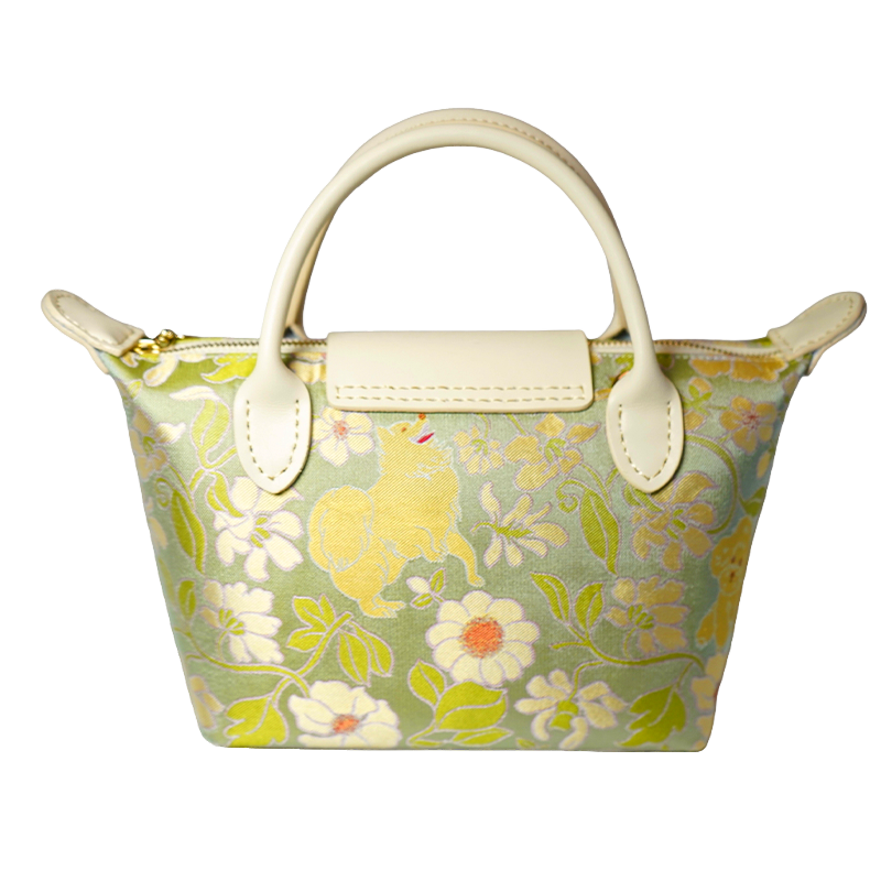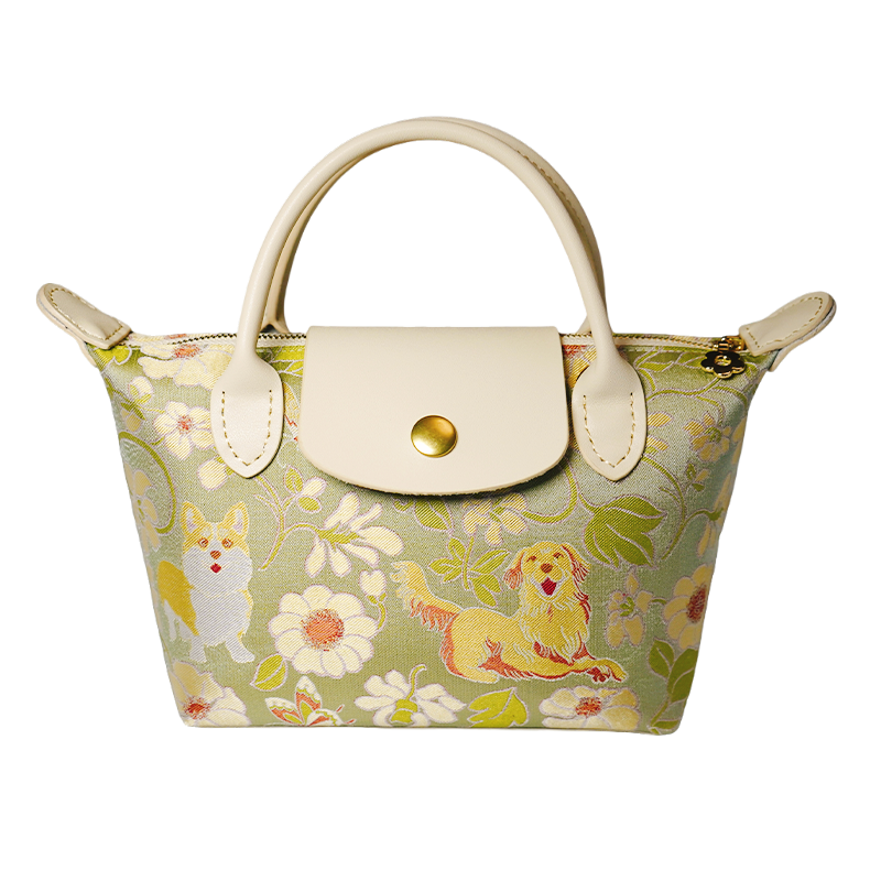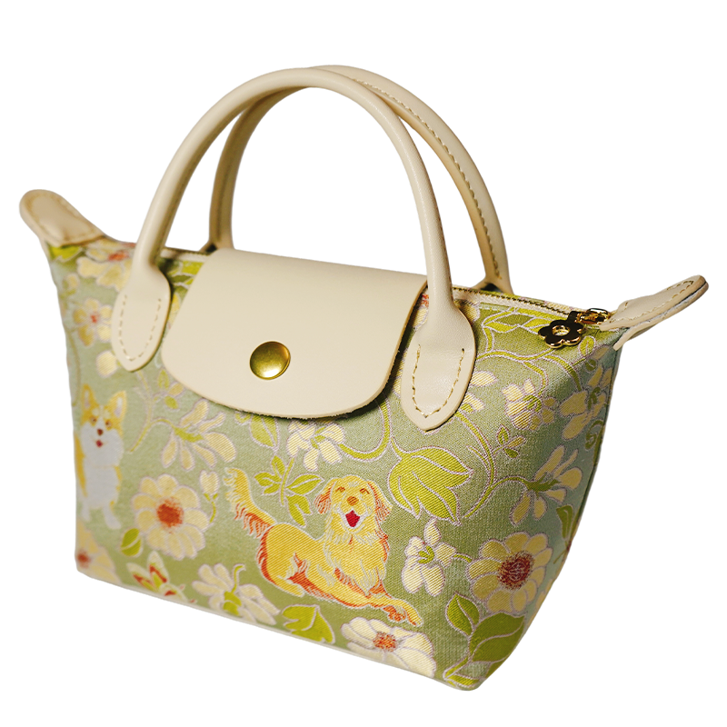 Carry the warmth of spring. This bag pairs exquisite Song Brocade silk with fine leather, capturing a scene of pure joy. Playful dogs and golden blooms are woven into this wearable art, symbolizing loyalty, renewal, and abundance.